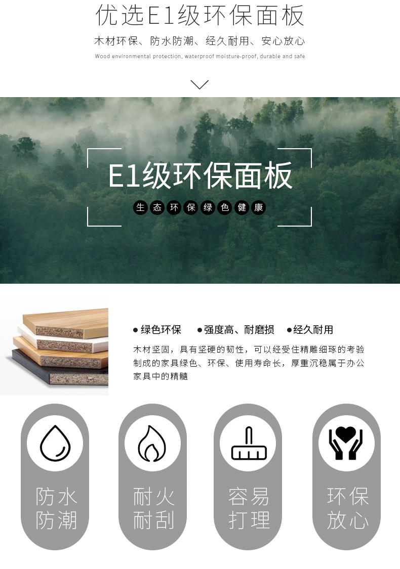基 材:E1級(jí)達(dá)歐洲環(huán)保標(biāo)準(zhǔn)基材(目前國內(nèi)辦公家具行業(yè)板式基材標(biāo)準(zhǔn)較高的),此基材用原木壓縮顆粒成型,甲醛含量小于1.2MG/L,具耐磨、抗刻劃、耐高溫、易清潔、耐酸堿等優(yōu)點(diǎn),經(jīng)防蟲、防腐處理,表面握釘力及靜曲強(qiáng)度均達(dá)到國家標(biāo)準(zhǔn);抗彎性能強(qiáng),不易變形。